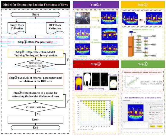 To address the time-consuming, labor-intensive, and inefficient nature of existing contact-based measurements of sow backfat thickness (BFT), in this study, a method to estimate BFT from depth images using deep learning and image processing is proposed. Measurements of BFT and hip depth images