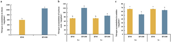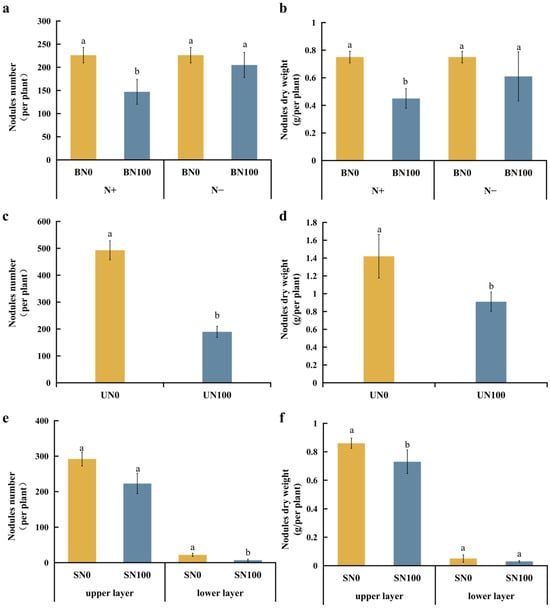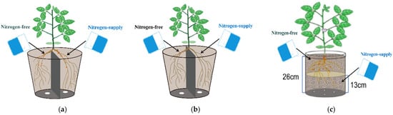 Nitrogen (N) fertilizers can promote soybean growth, nodulation, and nitrogen fixation to a certain extent. However, excessive nitrogen application inhibits the nitrogen fixation capacity of soybean nodules. In this study, three experimental materials were used to investigate the direct and indirect effects of localized exogenous nitrogen (Ammonium Nitrate, NH4NO3) on nodule nitrogen fixation in soybean. Three nitrogen supply methods were applied: bilateral nodulation dual-root soybeans, unilateral nodulation dual-root soybeans, and upper- and lower-layered soybeans. The root nitrogen accumulation of direct contact with exogenous nitrogen reached 72.61 mg/plant, 30.59 mg/plant, and 88.48 mg/plant, respectively, and its nitrogen accumulation ability was higher. Exogenous nitrogen inhibited nodule growth and nitrogen accumulation. Nodule development and nitrogenase activity were regulated both directly and indirectly by exogenous nitrogen, with a more pronounced inhibitory effect observed in the roots directly exposed to nitrogen. Experiment I demonstrated that the number and dry weight of nodules on the nitrogen supply side decreased by 35.04% and 40.00%, respectively, while the difference was not significant on the non-nitrogen supply side. Furthermore, the nodule system exhibited a substantial buffering effect on exogenous nitrogen. In Experiment I, no significant differences were observed in the number, dry weight, or nitrogenase activity of nodules on the non-nitrogen-supplying side. The number and dry weight of nodules in Experiment II decreased by 61.55% and 35.91%, respectively. The specific nitrogenase activity (SNA) and acetylene reduction assay (ARA) also decreased by 32.28% and 67.20%, respectively, showing significant differences. In Experiment III, the number and dry weight of nodules in the upper layers decreased by 23.70% and 15.12%, respectively. Furthermore, significant differences in nitrogenase activity were detected, indicating that the nodules exposed to exogenous nitrogen spontaneously initiated the nitrogen regulation mechanism. This partially offsets the inhibitory effect on the nitrogen fixation function of nodules on the indirectly exposed side. This study revealed that exogenous nitrogen supply significantly affected the growth efficiency and nodule nitrogen fixation function of soybean plants by regulating nitrogen absorption and resource allocation. The use of deep unilateral fertilization can ensure the nitrogen fixation capacity of nodules and nitrogen accumulation in soybean plants and provide theoretical support for improving nitrogen use efficiency and realizing scientific fertilization.