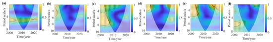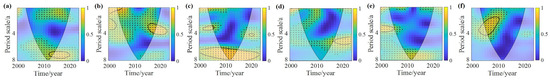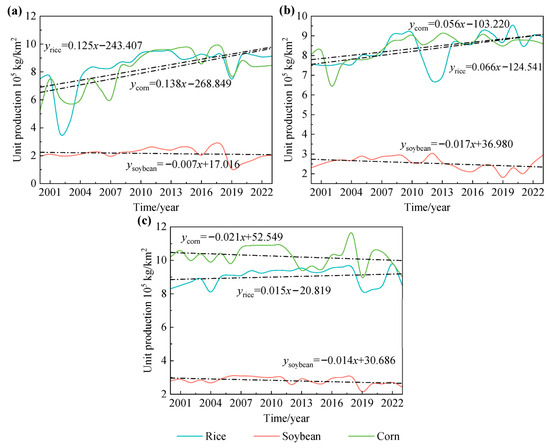 Against the backdrop of global warming and a reshaped hydrothermal regime, the albic soil belt of the Sanjiang Plain, a major grain base, requires farm-scale evidence of how meteorological variability couples with staple-crop yields. Using meteorological and yield records from 2000 to 2023 at three large farms (859, 850, and 852), this study applied the Mann–Kendall test, wavelet and cross-wavelet coherence, Pearson correlation, gray relational analysis, and principal component analysis to track the evolution of air temperature, precipitation, evaporation, sunshine duration, relative humidity, and surface temperature, and to assess their multi-scale impacts on rice, corn, and soybean yields. The region warmed and became wetter overall, with dominant periodicities near 21a and 8a. Across the three farms, yields were significantly and positively associated with precipitation and air temperature (R > 0.60). Rice yield correlated strongly and negatively with evaporation at Farm 850 (R = −0.61) and at Farm 852 (R = −0.503). At Farm 859, gray relational analysis ranked precipitation highest for rice, corn, and soybean (γ = 0.853, 0.844, and 0.826), followed by air temperature. The first two principal components explained 67.66% of the variance; PC1 (41.80%) loaded positively for air temperature, and PC2 (25.86%) for precipitation and relative humidity. Cross-wavelet coherence indicated stable coupling between yields and hydrothermal variables, with the strongest coupling for rice with precipitation and air temperature, prominent coupling for corn with air temperature and sunshine duration, and stage-dependent responses of soybean to precipitation and evaporation. These results show that long-term trends together with phase-specific oscillations jointly shape yield variability. The findings support translating phase identification and sensitive windows into crop-specific rules for sowing or transplanting arrangements, irrigation timing, and early warning, providing a quantitative basis for climate-adaptive management on the study farms and, where soils, management, and microclimate are comparable, for the wider Sanjiang Plain.