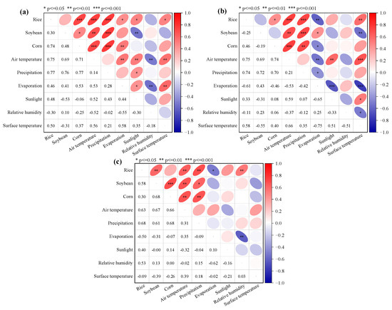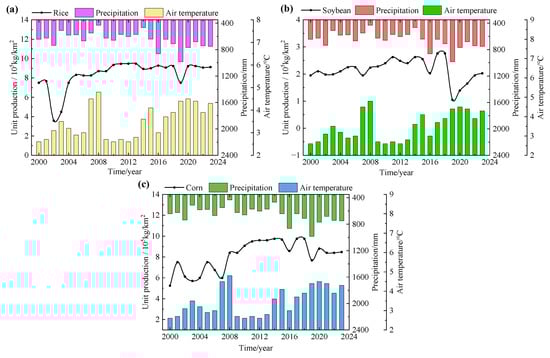Against the backdrop of global warming and a reshaped hydrothermal regime, the albic soil belt of the Sanjiang Plain, a major grain base, requires farm-scale evidence of how meteorological variability couples with staple-crop yields. Using meteorological and yield records from 2000 to 2023