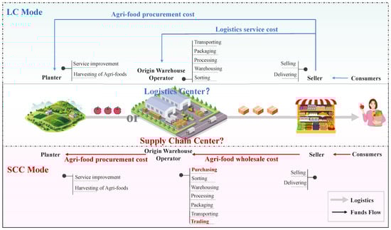 Origin warehouses, positioned at the critical “first mile” of the agri-food supply chain, profoundly influence supply chain power structures and profit allocation, as well as supply chain stability and sustainable development. To explore the role of origin warehouses in the agri-food supply chain, this study develops a three-level game model comprising a “planter–origin warehouse operator–seller” framework. Notably, this study conceptualizes the dual-functional “origin warehouse” as observed in practice, proposing two theoretical modes: the Logistics Center (LC) and the Supply Chain Center (SCC). By treating quality level, service level, and selling price decisions as endogenous variables, this study further reveals the interconnected decision-making mechanisms under different operational modes. Overall, the LC mode performs better in quality-driven markets, generating higher system profits and greater social welfare, whereas the SCC mode is superior when consumers are more price-sensitive or place greater value on service. Based on these findings, this study provides decision-making guidance for origin warehouse operators aiming to select the optimal mode under varying market conditions and proposes targeted coordination strategies to promote the high-quality development and economic sustainability of the agri-food supply chain.