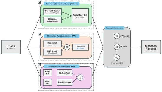 To address the challenging requirements of citrus detection in complex orchard environments, this paper proposes ACDNet (Adaptive Citrus Detection Network), a novel deep learning framework specifically designed for automated citrus harvesting. The proposed method introduces three key innovations: (1) Citrus-Adaptive Feature Extraction (CAFE)