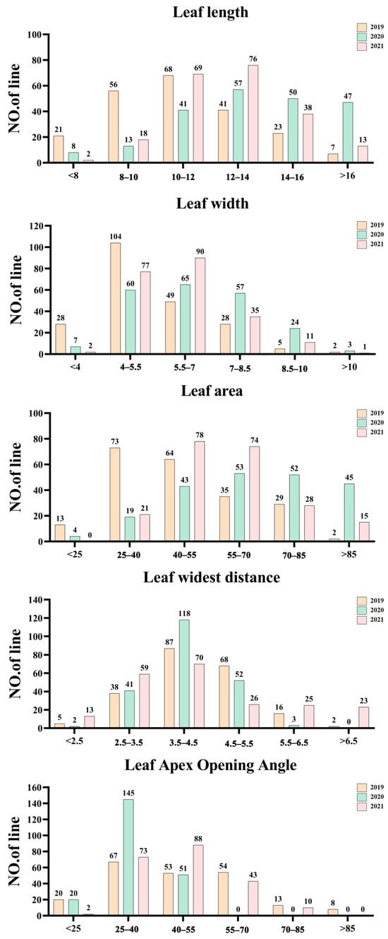 Soybean is the world’s foremost oilseed crop, and leaf morphology significantly influences yield potential by affecting light interception, canopy structure, and photosynthetic efficiency. In this study, leaf length, leaf width, maximum leaf width, leaf apex opening angle, and leaf area were measured in