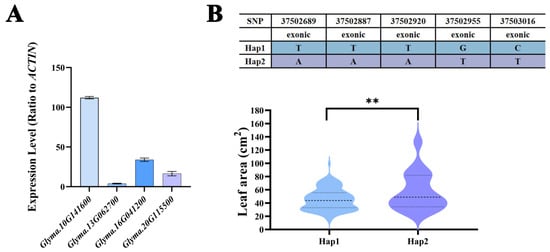 Soybean is the world’s foremost oilseed crop, and leaf morphology significantly influences yield potential by affecting light interception, canopy structure, and photosynthetic efficiency. In this study, leaf length, leaf width, maximum leaf width, leaf apex opening angle, and leaf area were measured in 216 soybean accessions, and genome-wide association studies (GWAS) were conducted using genomic resequencing data to identify genetic variants associated with leaf morphological traits. A total of 824 SNP loci were found to be significantly associated with leaf shape, and 130 candidate genes were identified in the genomic regions flanking these significant loci. KEGG enrichment analysis revealed that the above candidate genes were significantly enriched in arginine biosynthesis (ko00220), nitrogen metabolism (ko00910), carbon metabolism (ko01200), pyruvate metabolism (ko00620), glycolysis/glycogenolysis (ko00010), starch and sucrose metabolism (ko00500), plant–pathogen interaction (ko04626), and amino acid biosynthesis (ko01230). By combining KEGG and GO enrichment analysis as well as expression level analysis, four candidate genes related to leaf shape (Glyma.10G141600, Glyma.13G062700, Glyma.16G041200 and Glyma.20G115500) were identified. Further, through candidate gene association analysis, it was found that the Glyma.10G141600 gene was divided into two major haplotypes. The leaf area of haplotype 1 was significantly smaller than that of haplotype 2. Subsequently, the cutting amplification polymorphism sequence (CAPS) molecular marker was developed. The marker Chr.10:37502955 can effectively distinguish the differences in leaf size through enzymatic digestion technology, and has excellent typing ability and application potential. The above results can provide a theoretical basis for molecular-assisted selection (MAS) of soybean leaf morphology.