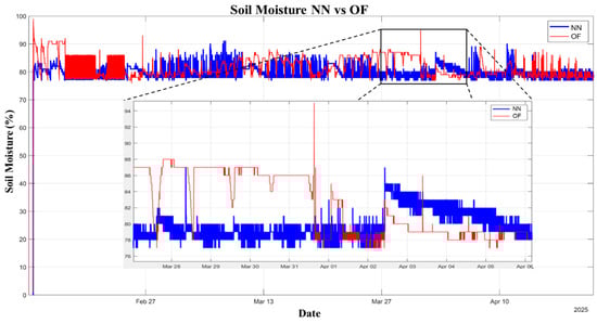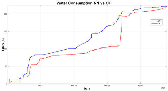 Water scarcity and inefficient irrigation practices are major challenges for modern protected agriculture systems. This study designs, implements, and experimentally validates a neural network-based irrigation control strategy in an industrial programmable logic controller (PLC) for a drip irrigation system operating in a laboratory-scale micro-tunnel greenhouse. The objective is to evaluate the real-time performance of an intelligent controller under practical operating conditions and to quantify its impact on water use efficiency and crop growth compared to a conventional on–off strategy. The neural network is trained using 1039 data samples, divided into training (70%), validation (15%), and test (15%) datasets, and is implemented in the PLC to regulate soil moisture through a proportional valve. Experimental validation is carried out over 67 days using a serrano chili pepper (Capsicum annuum L.) crop. Both controllers operate simultaneously under identical environmental and operating conditions. Performance is evaluated using soil moisture stability metrics, including mean squared error (MSE), mean absolute error (MAE), and standard error (SE), water consumption, and crop growth indicators prior to harvest. Results show that the neural network controller achieves higher soil moisture regulation accuracy (MSE = 3.2159%, MAE = 0.7560%, SE = 0.00001687%) and reduces the average daily water consumption per plant by 50.18% compared with the on–off controller. In addition, the absolute growth rate increases by 26.42%, with statistically significant differences. These results demonstrate that neural network-based control can be effectively implemented on industrial hardware and provide tangible benefits for water-efficient and precision irrigation systems.
