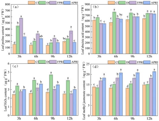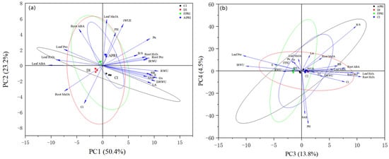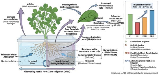 Alfalfa (Medicago sativa L.) is an important forage crop with significant economic value. Alternating partial root-zone irrigation (APRI) is a promising water-saving technique that has been shown to improve water use efficiency in various crops. In this study, the effects of APRI on root water uptake, photosynthetic indices, and physiological responses in alfalfa were investigated. Polyethylene glycol (PEG 6000) was used to simulate water stress, and four irrigation treatments were established: conventional irrigation (CI), deficit irrigation (DI), fixed partial root-zone irrigation (FPRI), and APRI. Principal component analysis (PCA) revealed that APRI reduced stomatal conductance (Gs) by 19.82% and transpiration rate (E) by 19.16%, which was associated with increased abscisic acid (ABA) content, thereby enhancing instantaneous water use efficiency (iWUE) by 47.93%. Meanwhile, APRI promoted root growth, leading to a 14.09% increase in root–shoot ratio, which in turn enhanced the photosynthetic rate by 22.06%. APRI enhanced methyl jasmonate (MeJA) content in alfalfa leaves by 45.23%, which was associated with a 24.13% improvement in water absorption capacity. In conclusion, APRI induced positive physiological responses in alfalfa, with the effectiveness ranked as follows: APRI > CI > FPRI > DI. These findings provide a theoretical basis for the rational application of APRI in alfalfa forage production.