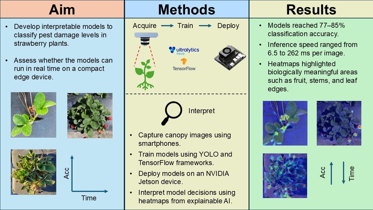 Traditional plant scouting is often a costly and labor-intensive task that requires experienced specialists to diagnose and manage plant stresses. Artificial intelligence (AI), particularly deep learning and computer vision, offers the potential to transform scouting by enabling rapid, non-intrusive detection and classification of early stress symptoms from plant images. However, deep learning models are often opaque, relying on millions of parameters to extract complex nonlinear features that are not interpretable by growers. Recently, eXplainable AI (XAI) techniques have been used to identify key spatial regions that contribute to model predictions. This project explored the potential of convolutional neural networks (CNNs) for classifying the severity of chilli thrips damage in strawberry plants in Florida and employed XAI techniques to interpret model decisions and identify symptom-relevant canopy features. Four CNN architectures, YOLOv11, EfficientNetV2, Xception, and MobileNetV3, were trained and evaluated using 2353 square RGB canopy images of different sizes (256, 480, 640 and 1024 pixels) to classify symptoms as healthy, moderate, or severe. Trade-offs between image size, model parameter count, inference speed, and accuracy were examined in determining the best-performing model. The models achieved accuracies ranging from 77% to 85% with inference times of 5.7 to 262.3 ms, demonstrating strong potential for real-time pest severity estimation. Gradient-Weighted Class Activation Mapping (Grad-CAM) visualization revealed that model attention focused on biologically relevant regions such as fruits, stems, leaf edges, leaf surfaces, and dying leaves, areas commonly affected by chilli thrips. Subsequent analysis showed that model attention spread from localized regions in healthy plants to wide diffuse regions in severe plants. This alignment between model attention and expert scouting logic suggests that CNNs internalize symptom-specific visual cues and can reliably classify pest-induced plant stress.