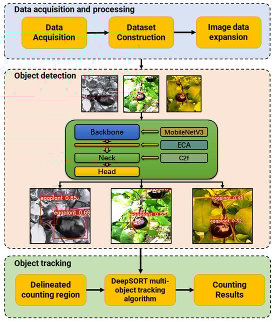 Accurate fruit counting is essential for yield evaluation and automated management in greenhouse eggplant production. This study presents a lightweight detection and counting method based on an improved YOLOv5s–DeepSORT framework. To reduce computational cost while preserving accuracy, we replace the YOLOv5s backbone with