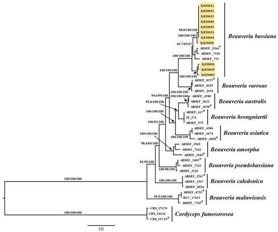 Cylas formicarius (Fabricius) is a major pest of sweet potato in Taiwan, where no microbial control agents are currently available. This study aimed to identify Beauveria bassiana strains with both high virulence and high spore productivity using a rice-based solid-state fermentation (SSF) system. Eleven field isolates were characterized using morphological traits and multilocus sequence analyses (Bloc, RPB1, RPB2, and TEF). Laboratory assays compared conidial production on 1/2 potato dextrose agar (PDA) and rice substrates and evaluated pathogenicity against adult C. formicarius by estimating median lethal time (LT50) and the onset of mortality (t0) based on cumulative mortality data. Substantial variation was observed among isolates in growth performance, sporulation, and virulence. Strain TyEf0054 consistently exhibited high pathogenicity, causing more than 80% mortality with conidia produced from both 1/2 PDA and rice, and showed rapid killing activity, with LT50 values of approximately 5.5–5.9 days and t0 values ranging from 3.55 to 3.99 days. In contrast, some strains exhibited high sporulation and virulence on 1/2 PDA but failed to produce conidia or showed severe clumping during rice-based solid-state fermentation, indicating poor suitability for large-scale production. These results demonstrate that high laboratory virulence alone is insufficient for strain selection and highlight the importance of integrating killing speed, final mortality, and SSF compatibility as joint selection criteria. Overall, TyEf0054 represents a promising locally adapted candidate for the development of commercial mycoinsecticides for sustainable management of sweet potato weevil in Taiwan.