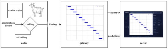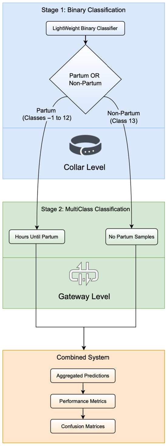 Kidding in goats is a highly significant event with major economic implications and strong impacts on the welfare of both the offspring and the mothers. Monitoring the process is extremely demanding, as it is impossible to predict precisely when it will occur. For this reason, the automatic detection of kidding has the potential to generate substantial productivity gains while also improving animal well-being. Artificial intelligence techniques based on accelerometry data have been explored for identifying the event, but these approaches typically rely on data loggers, which cannot trigger real-time alerts or assistance. Embedding detection mechanisms directly into wearable devices enables much faster identification and supports energy-efficient operations. However, this approach also introduces considerable challenges, particularly due to the strict constraints of wearable devices in terms of weight, cost, and battery life. The present work documents the development of a real-time, automatic kidding-detection mechanism in which the detection workload is distributed between the collar and an edge device. System evaluation demonstrated the feasibility of this distributed architecture, confirming that both components can cooperate effectively to achieve reliable detection. The system achieved a Matthews Correlation Coefficient performance of 0.91, highlighting the robustness and practical viability of the proposed solution.