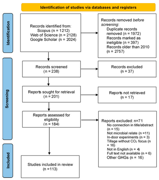 Soil microbes are central to carbon and nutrient cycling; however, the influence of tillage practices on plant–soil microbe interactions, particularly their contribution to carbon stabilization under increasing atmospheric CO2, remains insufficiently understood. This systematic review evaluated 238 studies published between 2010