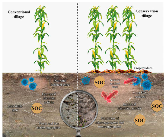 Soil microbes are central to carbon and nutrient cycling; however, the influence of tillage practices on plant–soil microbe interactions, particularly their contribution to carbon stabilization under increasing atmospheric CO2, remains insufficiently understood. This systematic review evaluated 238 studies published between 2010 and 2025 from Scopus, Web of Science (WoS), and Google Scholar, of which 113 met the inclusion criteria related to carbon dynamics, agro-climatic conditions, and soil–microbial processes. Evidence indicates that conventional plowing (CP) disrupts microbial structure, habitat, and function, resulting in lower soil organic carbon (SOC) stocks and elevated CO2 emissions. Conversely, conservation tillage promotes rhizodeposition, microbial biomass carbon (MBC) accumulation, and enhanced nitrogen (N) and phosphorus (P) availability, thereby increasing SOC sequestration and reducing CO2 emissions. Overall, insights from this study will enhance our understanding of beneficial microbes that enhance carbon stabilization and root exudate compounds, which trigger specifically needed nutrients in the rhizosphere.