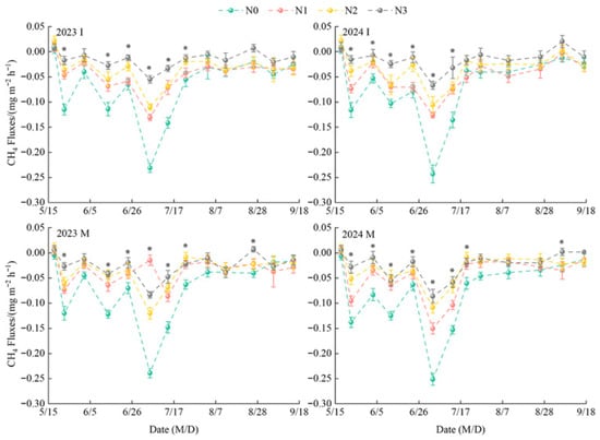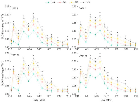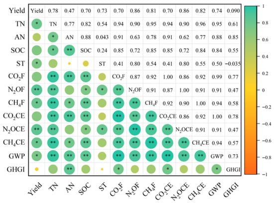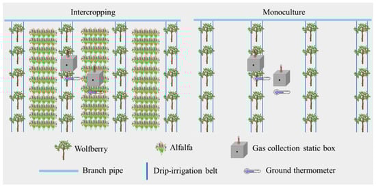 Background: Amidst the pressing need to balance global food security and climate governance, achieving synergistic optimisation between crop yield enhancement and agricultural greenhouse gas reduction has become the central imperative for advancing the transition to green agriculture. Purpose: To investigate the effects of cropping systems and nitrogen fertiliser application on goji berry production systems in arid regions. Method: This study employed two cropping systems (goji berry–alfalfa intercropping (I), goji berry monocropping (M)), and four nitrogen application rates (N0 (0 kg ha−1), N1 (150 kg ha−1), N2 (300 kg ha−1), N3 (450 kg ha−1)). The effects of planting patterns and nitrogen fertiliser regulation on the physicochemical properties of goji berry farmland soil, greenhouse gas emissions, and yield were analysed. Result: (1) Soil temperatures under I were significantly lower than under M, and nitrogen application levels, cropping systems, and the interaction between nitrogen application and cropping systems significantly influenced soil nutrients; (2) Cultivation patterns and nitrogen application levels exerted a highly significant influence on soil greenhouse gas emission fluxes in goji berry fields. CO2 emission flux peaked under IN3 treatment (annual average: 342.45 mg m−2 h−1), while N2O emissions peaked under MN3 (annual average 0.23 mg m−2 h−1). CH4 absorption was highest under MN0 (annual average −0.25 mg m−2 h−1); (3) Cropping systems and nitrogen application rates significantly influence greenhouse gas indicators including cumulative CO2 emissions, cumulative N2O emissions, and GWP. At the same nitrogen application level, GWP decreased by 5.63% on average in M compared to I, while under the same cropping system, N3 increased by 62.45% on average in N3 compared to N0; (4) Cropping systems and nitrogen application levels significantly influenced goji berry yield and economic returns. Under the same cropping system, N2 yielded the highest goji berry production and return on investment, with I and M yielding 2768.99 kg ha−1 and 4.06 and 3067.78 kg ha−1 and 3.15, respectively. Conclusions: The IN2 reduced soil greenhouse gas emission fluxes, cumulative emissions, and global warming potential while simultaneously increasing goji berry yield, net revenue, and return on investment. This approach minimises land resource wastage and represents a management model for achieving high yields with reduced emissions in goji berry fields within the Yellow River diversion irrigation districts of Gansu Province and similar ecological zones.