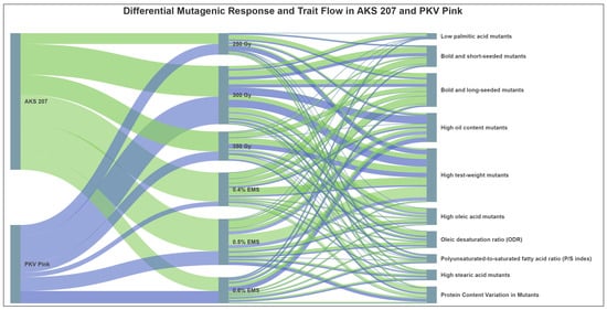 The high-oleic acid content of the safflower (Carthamus tinctorius L.) oil, regulated by the fatty acid desaturase 2-1 (CtFAD2-1) gene, provides superior oxidative stability for applications. To explore alternative genetic sources for this trait, we employed induced mutagenesis with gamma irradiation and ethyl methane sulfonate (EMS) for two safflower cultivars, AKS 207 and PKV Pink. Screening of M2 populations identified several mutants with significantly higher oleic acid content, reaching up to 36.86%. The mutagenized populations also exhibited a wide spectrum of variation for other agronomically important traits, including increased oil content (up to 35.19%), enhanced seed protein (up to 22.51%), and seed size and weight. Correlation and principal component analyses confirmed the antagonistic relationship between oleic and polyunsaturated fatty acids and the positive association among seed size parameters. Molecular profiling using an allele-specific PCR assay targeting the CtFAD2-1 locus revealed that high-oleic mutants did not carry known mutations, suggesting the involvement of alternative alleles, micro-mutations, or other genes regulating oleic acid accumulation. This study provides valuable pre-breeding germplasm with improved agronomic and quality traits and identifies novel genetic sources for high-oleic acid in safflower. These mutants form a new genetic basis for understanding fatty acid biosynthesis and developing next-generation high-stability oil cultivars.