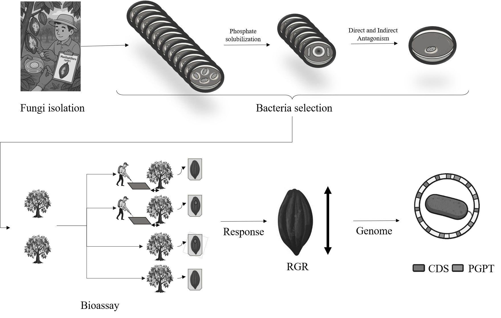 The application of plant growth-promoting bacteria (PGPB) offers a sustainable alternative for improving cacao (Theobroma cacao L.) health and productivity. This study evaluated the relative growth rate (RGR) of cacao fruits under four field treatments for 30 days: PGPB alone, PGPB plus