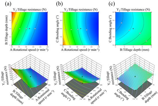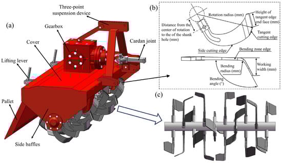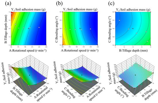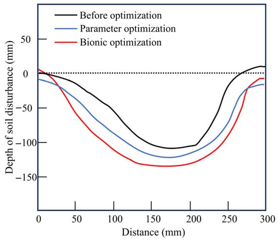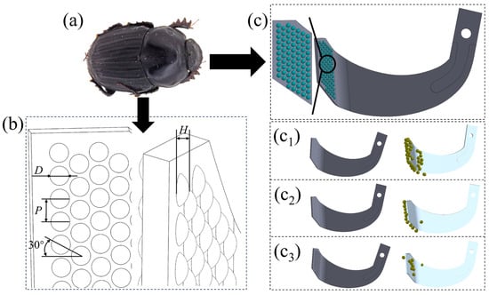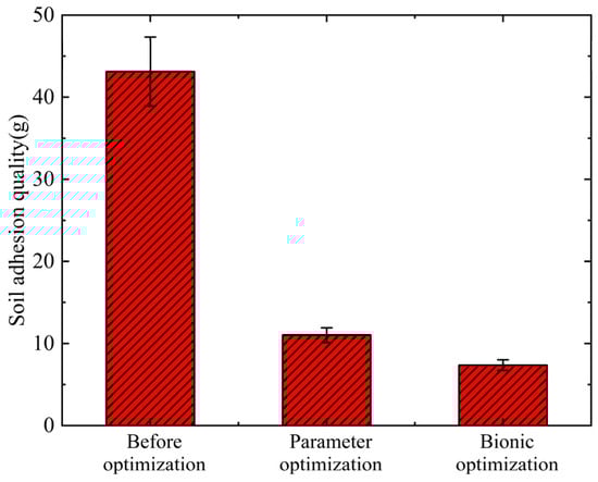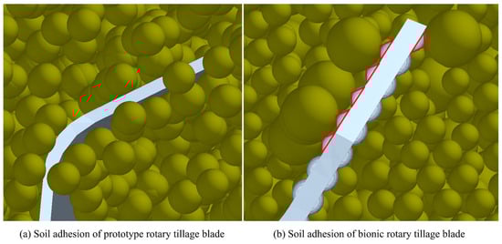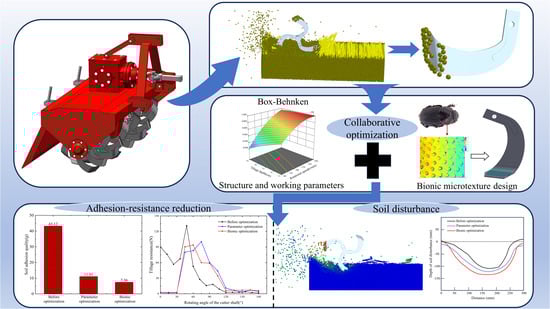 Rotary tillage blades are critical soil-engaging components in conservation tillage systems but are prone to adhesion of soil particles under cohesive soil conditions, which increases tillage resistance, degrades tillage quality, and lowers operational efficiency. To address these issues, this study proposed a collaborative strategy that combines parameter optimization of rotary tillage blades with a bionic microtexture design to reduce adhesion and resistance and improve operation performance. A coupled soil–wheat straw–rotary tillage blade model based on the Discrete Element Method (DEM) and Multibody Dynamics (MBD) was established in loessial soil environment. The structure and working parameters of the rotary tillage blade were optimized using a Box–Behnken experimental design. On this basis, a bionic microtexture design was introduced on regions prone to adhesion of the rotary tillage blade, inspired by the non-smooth convex hull microstructure on the head surface of the dung beetle. The results indicated that the optimal parameter combination (rotational speed 244 r·min−1, tillage depth 110 mm, and bending angle 122°) reduced soil adhesion mass and tillage resistance by 74.47% and 23.44%, respectively. After applying the bionic microtexture, the corresponding reductions further increased to 82.93% and 28.35%. Moreover, the bionic-optimized rotary tillage blade outperformed the original design in disturbance depth and range and exhibited improved energy consumption performance. Overall, the results demonstrated that coupling parameter optimization with bionic microtexture design substantially enhanced adhesion and resistance reduction and improved soil-disturbance performance, thereby providing theoretical support for the development of high-performance rotary tillage blades.