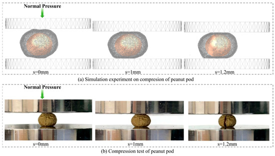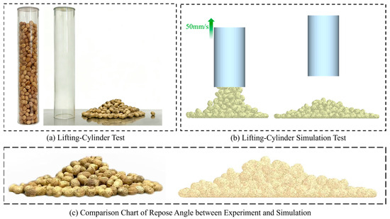 The peanut, a globally important oil and economic crop, has thin, brittle pods that are prone to breakage under external forces during mechanical harvesting, transportation, and processing. To minimize this loss and reduce production costs, we conducted an in-depth study of the pod-breaking process by integrating manual and automatic filling approaches within the discrete element method (DEM) with the Hertz–Mindlin with bonding model. A breakable layered bonding model for peanut pods was developed, which is capable of precisely characterizing the disparities in the mechanical properties of peanut pod shells and kernels. Physical tests were performed to obtain the relevant contact parameters of peanut pods. Compression tests combined with calibration approaches were employed to identify the bonding parameters of peanut pods, which are not easily accessible via direct experimental measurements. The optimal combination of simulation parameters for the model was determined via a Plackett–Burman test, steepest ascent test, and Box–Behnken test. The results indicated that the critical normal stress between pod shells is the most significant influencing factor. The optimal parameter combination for the proposed model is as follows: the normal stiffness per unit area between pod shells is 7.81 × 1010 N/m3, the shear stiffness per unit area between pod shells is 9.00 × 108 N/m3, the critical normal stress between pod shells is 2.17 × 105 N/m3, and the critical shear stress between pod shells is 2.25 × 105 N/m3. The established layered bonding model for breakable peanut pods was validated using both cylinder-lifting simulation tests and physical shelling experiments. The relative error in the angle of repose between the cylinder-lifting simulation and physical tests was 1.6%, while the deviation in the shelling experiment was only 0.7%. This model provides a theoretical foundation for the design and optimization of machinery used in peanut pod harvesting, transportation, and processing.