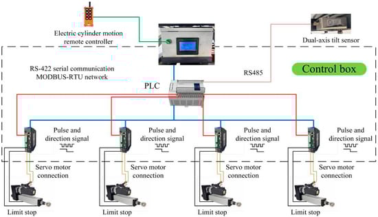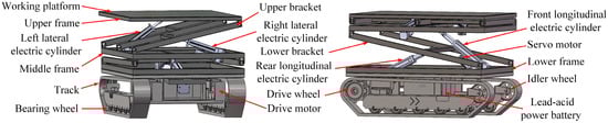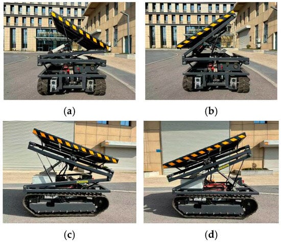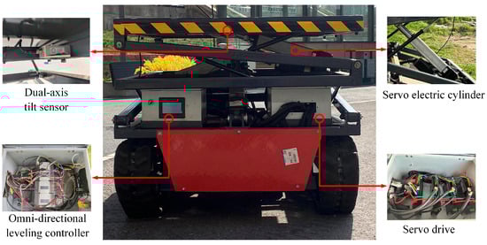 In response to the problems of poor operating stability and easy tipping of small agricultural machinery under the complex terrain of hilly and mountainous areas, this study designed a tracked mobile platform suitable for hilly and mountainous areas and equipped with an omnidirectional leveling function. The omnidirectional leveling system adopted an innovative coordinated leveling scheme with four servo-electric cylinders of “dual lateral and dual longitudinal” structure. Integrated with dual-axis tilt sensors and a PLC control system, the system enabled decoupled leveling in both the lateral and longitudinal directions. Dynamic simulations of the platform’s leveling process under typical working conditions were performed using ADAMS. The simulation results verified the feasibility of the omnidirectional leveling system. Field tests on slopes in hilly and mountainous areas demonstrated that the omnidirectional leveling system achieves rapid leveling on steep slopes within 5–6 s. After leveling, the average fuselage inclination angle was stabilized within 2°, with a standard deviation of less than 3.4°. This study provided a reliable technical solution and design reference for agricultural machinery manufacturers, while offering users a safer and more efficient platform for operations in complex mountainous areas, significantly reducing the risk of overturning.