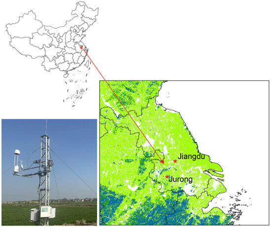 Under global climate warming, the impact of extreme high temperatures on carbon exchange in paddy rice ecosystems remains unclear, yet they exert a profound influence on the carbon cycle in agricultural ecosystems. The characteristics of carbon dioxide (CO2) fluxes and their response to temperature were explored at two sites (Jurong and Jiangdu) across the lower reaches of the Yangtze River in China using open-path eddy covariance observations in 2021–2024. During the rice-growing season, considerable inter-annual spatial variability in high temperature was observed, with a higher frequency and larger intensity in Jurong relative to Jiangdu and more severe heat stress in 2022 relative to 2023. The jointing–booting stage was identified as the hotspot exposed to the highest frequency and longest duration of high temperature across multiple years. There was obvious variation in net ecosystem CO2 exchange (NEE) throughout the rice-growing season, with the cumulative values being −462.2 ± 55.2 gC·m−2 in 2021–2023 at Jurong and −362.4 ± 43.0 gC·m−2 in 2022–2024 at Jiangdu. The period from jointing to flowering was identified as the most sensitive time slice for NEE variation, with a daily average value of −6.3 ± 0.2 gC·m−2·d−1 in jointing–booting and −5.2 ± 2.2 gC·m−2·d−1 in booting–flowering at Jurong, as well as −4.0 ± 0.7 gC·m−2·d−1 in jointing–booting and −5.7 ± 1.1 gC·m−2·d−1 in booting–flowering at Jiangdu. The respective correlation coefficients were −0.59 and −0.37 between periodical NEE and mean air temperature at Jurong and Jiangdu, meaning that NEE showed a decreasing trend as temperature increased, owing to the simultaneous but heterogeneous changes in gross ecosystem CO2 exchange and ecosystem respiration. When the temperature was lower than 38 °C, the corresponding correlation coefficient reached −0.85 at Jurong and −0.52 at Jiangdu, suggesting that extreme high temperature prevented a decline in NEE. The response of NEE to temperature highlighted that NEE ceased to decrease when temperature surpassed 38 °C, implying that a critical threshold existed for limiting the carbon sink under extreme high temperature. These findings could provide insight for understanding carbon cycling in agricultural systems under an extreme climate.