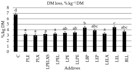 Silage additives formulated with lactic acid bacteria (LAB) are commonly applied to enhance fermentation efficiency and aerobic stability. However, comparative evaluations across different forage species are still scarce. This in vitro experiment assessed the influence of eleven commercial silage inoculants containing various combinations of homo- and heterofermentative LAB on fermentation dynamics, nutrient conservation, and aerobic stability of medium-wilted alfalfa (Medicago sativa L.), perennial ryegrass (Lolium perenne L.), and red clover/perennial ryegrass silages. Experimental silages were prepared in 3 L laboratory silos and stored for 90 days. All inoculated treatments exhibited significantly lower pH values at both 3 and 90 days of ensiling compared with the untreated control (p < 0.05). LAB application increased the concentration of total fermentation acids and lactic acid in all forage types, although responses varied depending on inoculant composition. Inoculants containing Lentilactobacilllus buchneri produced the greatest acetic acid concentrations and resulted in a marked enhancement of aerobic stability. Compared with the control, silage inoculation significantly decreased dry matter losses by 35–64% and ammonia-N proportion by 20–37%, leading to an additional dry matter recovery of 1.29–2.87%. Control silages showed the lowest aerobic stability (97.2 h), while inoculated silages ranged from 126.0 to 200.4 h, with the extent of improvement differing among forage species and LAB formulations. In conclusion, commercial silage inoculants incorporating diverse LAB strains effectively improve fermentation quality, limit nutrient degradation, and enhance aerobic stability of legume and grass silages under controlled experimental conditions.