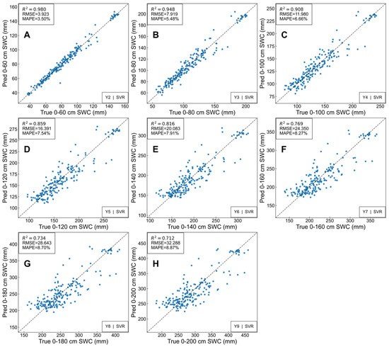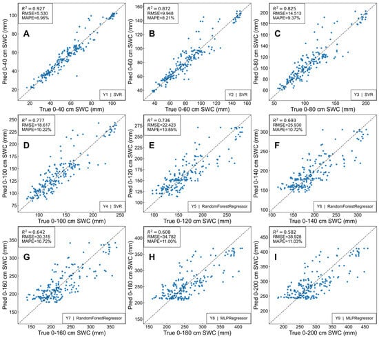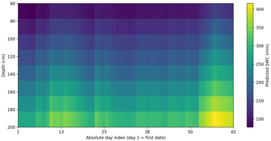 Soil profile moisture (0–200 cm) in agricultural fields is a critical variable determining root-zone water storage and irrigation scheduling accuracy, yet continuous deep-layer monitoring is constrained by equipment costs and installation difficulties. This study developed a near-real-time reconstruction model for soil moisture profiles across the 0–200 cm depth based on shallow-layer (0–20 cm, 20–40 cm) real-time monitoring data and multi-day accumulated meteorological features. Using field measurements from 2023 to 2025, Random Forest (RF), Gradient Boosting Decision Tree (GBDT), and Support Vector Regression (SVR) models were compared across different input scenarios and cumulative time windows. The results showed that using only surface moisture as input (Scenario A), prediction R2 ranged from 0.87 to 0.93 for shallow layers (≤80 cm) but decreased to 0.58 for deep layers (140–200 cm). Incorporating multi-day meteorological accumulation (Scenario B) improved R2 by 0.05–0.08. When dual-layer moisture and meteorological drivers were combined (Scenario D), shallow-layer R2 reached 0.96–0.98 with RMSE < 7 mm, mid-layer performance maintained at 0.85–0.90, and deep layers still achieved 0.76–0.84. Optimal time windows exhibited depth-dependent patterns: 5–10 days for shallow layers, 10–15 days for mid-layers, and ≥20 days for deep layers. Rolling validation demonstrated high consistency between model predictions and observations in the 0–80 cm range (R2 > 0.90, RMSE < 10 mm), enabling stable estimation of 0–200 cm profile dynamics. This approach eliminates the need for deep probes while achieving low-cost, interpretable, and deployable near-real-time deep moisture estimation, providing an effective technical pathway for precision irrigation and water management in semi-arid regions.