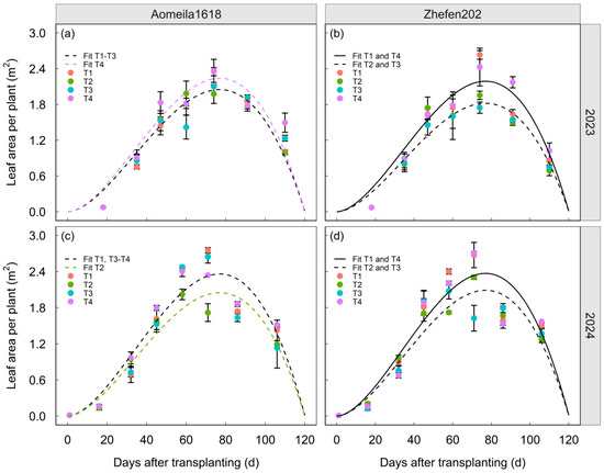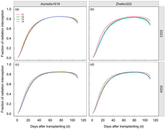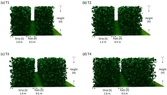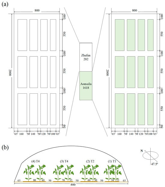 Canopy configuration affects crop yields by optimizing radiation interception and/or use efficiency in greenhouses. Although tomato metrics have been reported, the effects of row spacing on growth, yield and radiation for different cultivars are not well documented. Here, we examined tomato growth, yield, radiation interception and use efficiency in a greenhouse with four row spacing patterns (T1: 50 cm, T2: 60 cm, T3: 70 cm and T4: 80 cm) and two tomato cultivars (Aomeila1618 and Zhefen202) over a two-year period. A constructed intermediate model was used to simulate tomato radiation interception. Although there were great differences in the genotypes between the two selected cultivars, 50 cm (T1) was the optimal row spacing to produce a larger leaf area per unit of land area, intercept more radiation and ultimately achieve higher yield than the other three row spacing patterns (T2, T3 and T4). The mean total radiation interception across years and cultivars was 559.43 MJ m−2 in T1, 2.8–3.8% higher than in the other three row spacing patterns. Despite similar dry matter and RUE to Aomeila1618, Zhefen202 in the narrow strip used light more efficiently. These results will help to optimize canopy structures by taking cultivar-specific responses in RUE and growth traits into consideration for high-efficiency tomato production in greenhouses.