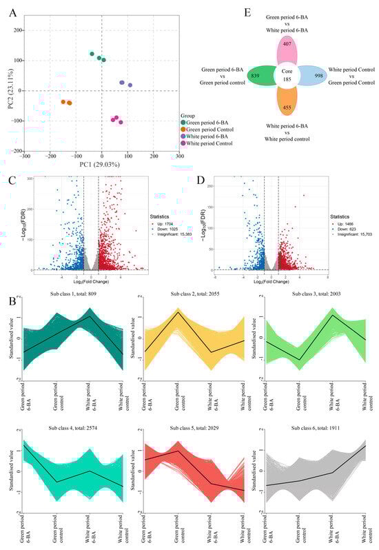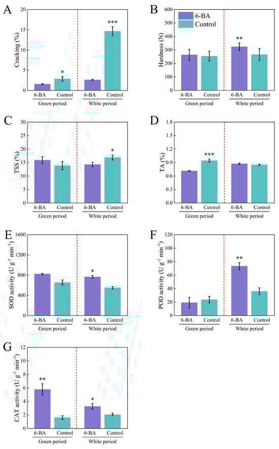 Fruit cracking in jujube is a major constraint on the sustainable development of the jujube industry. In this study, 60 mg L−1 of 6-Benzylaminopurine (6-BA) was foliar-sprayed at the early fruit stage. Fruit cracking incidence was recorded during the green and white
