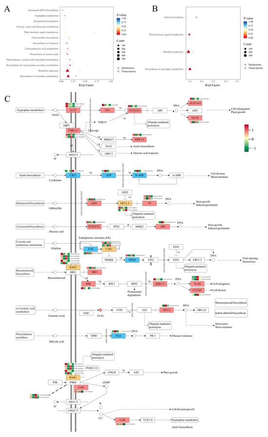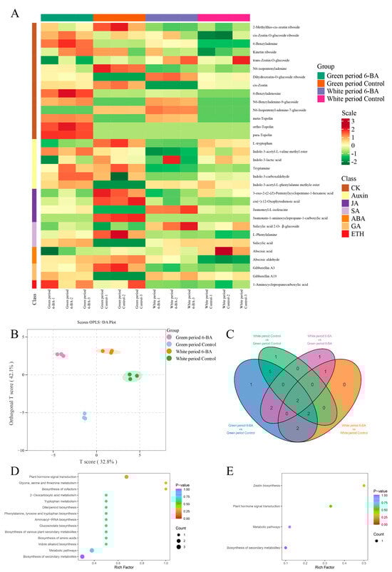 Fruit cracking in jujube is a major constraint on the sustainable development of the jujube industry. In this study, 60 mg L−1 of 6-Benzylaminopurine (6-BA) was foliar-sprayed at the early fruit stage. Fruit cracking incidence was recorded during the green and white fruit periods, and these observations were integrated with transcriptomic and metabolomic analyses to explore the potential mechanisms by which 6-BA influences fruit cracking. The results showed that the fruit cracking in the treatment groups was 53% and 18% of that in the control group during the green period and the white period, respectively. In jujube peel, catalase (CAT) activity was significantly increased in the treated peel during both periods. In the peel metabolites, compounds belonging to the cytokinin (CTK) category exhibited significant accumulation in both periods. Transcriptomic analysis showed that differentially expressed genes (DEGs) were enriched in pathways related to starch and sucrose metabolism, plant hormone signal transduction, and cellular polysaccharide metabolism. These findings suggest that 6-BA treatment may alleviate jujube fruit cracking by enhancing antioxidant capacity, modulating hormone homeostasis, and upregulating genes associated with carbohydrate and cell wall metabolism.