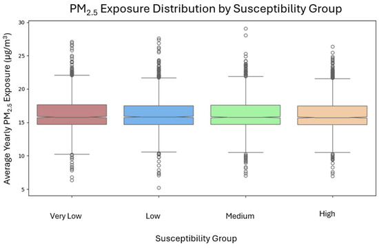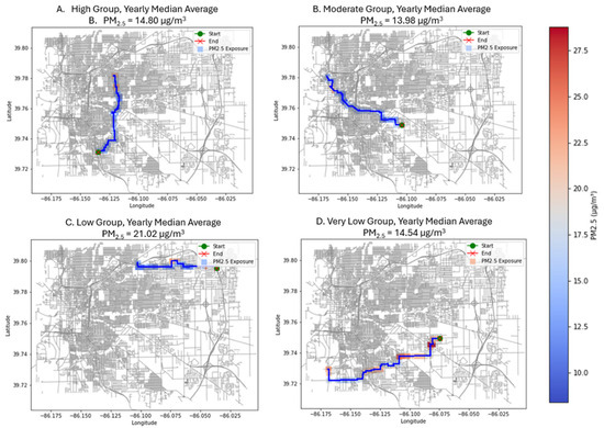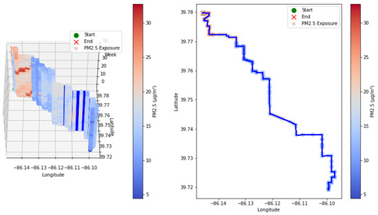 Fine particulate matter (PM2.5) poses substantial urban health risks that vary across space, time, and population vulnerability. We integrate a spatio-temporal INLA–SPDE PM2.5 field with an agent-based model (ABM) of 10,000 daily home–work commuters in Indianapolis’s Pleasant Run airshed (50 weeks; 250 m grid). The PM2.5 surface fuses 23 corrected PurpleAir PA-II-SD sensors with meteorology, land use, road proximity, and MODIS AOD. Validation indicated strong agreement (leave-one-out R2 = 0.79, RMSE = 3.5 μg/m3; EPA monitor comparison R2 = 0.81, RMSE = 3.1 μg/m3). We model a spatial-equity counterfactual by assigning susceptibility independently of residence and workplace, isolating vulnerability from residential segregation. Under this design, annual PM2.5 exposure was statistically indistinguishable across groups (16.22–16.29 μg/m3; max difference 0.07 μg/m3, <0.5%), yet VWDI differed by ~10× (High vs. Very Low). Route-level maps reveal recurrent micro-corridors (>20 μg/m3) near industrial zones and arterials that increase within-group variability without creating between-group exposure gaps. These findings quantify a policy-relevant “floor effect” in environmental justice: even with perfect spatial equity, substantial health disparities remain driven by susceptibility. Effective mitigation, therefore, requires dual strategies—place-based emissions and mobility interventions to reduce exposure for all, paired with vulnerability-targeted health supports (screening, access to care, indoor air quality) to address irreducible risk. The data and code framework provides a reproducible baseline against which real-world segregation and mobility constraints can be assessed in future, stratified scenarios.