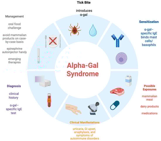 Alpha-gal syndrome (AGS) is an emerging, relatively newly recognized allergic disorder with clinical manifestations that occur as a result of hypersensitivity reactions to oligosaccharide galactose-α-1,3-galactose (α-gal), a carbohydrate present in lower-mammalian meat, dairy products, and some biopharmaceutical products. These reactions are delayed with