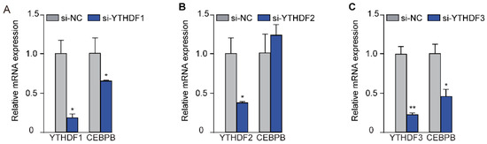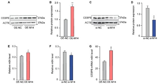 N6-methyladenosine (m6A), a predominant and reversible modification of mammalian RNA, plays a critical role in regulating growth, development, and metabolism. While methyltransferase-like 14 (METTL14) is an essential component of the m6A methyltransferase complex, its specific function in regulating milk fat metabolism in dairy goats remains unexplored. This study therefore aimed to elucidate the role of METTL14 in lipid metabolism within dairy goat mammary epithelial cells (GMECs). METTL14 overexpression significantly promoted the synthesis of TAG (Triacylglycerol) and TC (Total cholesterol), as well as lipid droplet accumulation in GMECs. Furthermore, METTL14 upregulated CCAAT enhancer binding protein beta (CEBPB) expression at both the mRNA and protein levels by directly inducing m6A modification on its transcripts. Finally, we confirmed that m6A modification occurs specifically at site 1662 of CEBPB mRNA, and the “Readers” YTH N6-methyladenosine RNA binding protein F1 and F3 (YTHDF1/3) were found responsible for the m6A site recognition and interpretation. This study demonstrated that METTL14 facilitates lipid synthesis and deposition in GMECs. Mechanistically, METTL14 installs the m6A modification at site 1662 of CEBPB transcripts. This m6A mark is specifically recognized by the readers YTHDF1 and YTHDF3, which promote the translation of CEBPB mRNA, thereby upregulating its expression.