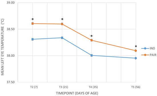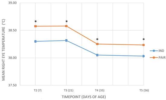 Pair housing has been proven to improve calves’ welfare during the pre-weaning phase, potentially promoting positive emotions. Based on the emotional valence hypothesis, according to which positive emotions are mainly processed in the left brain hemisphere, infrared thermography (IRT) may detect changes in eye temperature, particularly thermal asymmetries. This study aimed to evaluate whether pair-housed calves presented ocular thermal asymmetry, compared to individually housed calves during the pre-weaning phase. Fifty-six Friesian female calves from two commercial dairy farms were enrolled and housed either individually or in pairs from birth until 8 weeks of age. IRT images of the lacrimal caruncle of both eyes were collected at 7, 21, 35, and 56 days of age. A linear mixed model tested the effects of housing, farm, year, and timepoint. No significant effect of pair housing on ocular asymmetry emerged, while absolute eye temperatures were significantly higher in pair-housed calves. Moreover, eye temperature declined over time, suggesting reduced arousal and habituation with age. Although the lateralization hypothesis was not confirmed, the study offers insights into IRT for assessing calf emotions and supports further investigation in positive contexts to better explore links between housing, emotional valence, and brain activity.