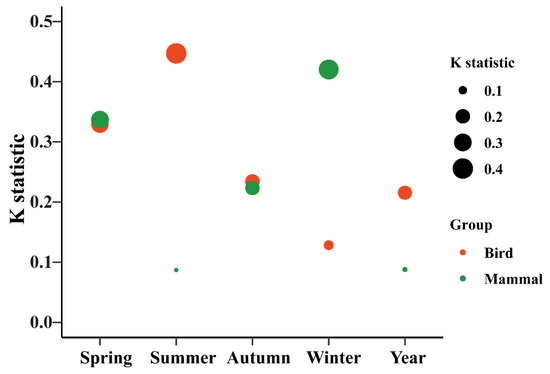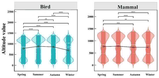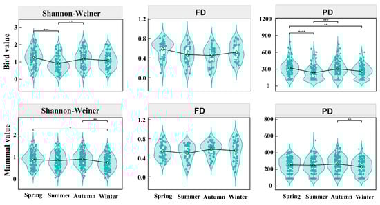 Montane forests, characterized by complex terrain and diverse climates, serve as critical global biodiversity hotspots, particularly for birds and mammals. However, the patterns and underlying processes of bird and mammal diversity remain insufficiently studied in the montane forests of eastern China. This study employed infrared-triggered camera trapping to conduct a four-year field monitoring of birds and mammals, analyzing the effects of plant diversity and seasonal variations on the diversity of habitat-associated animals. Our results revealed that species-level habitat visit frequency in ground-dwelling birds exhibited a significant phylogenetic signal, particularly in spring and summer. Plant diversity metrics demonstrated significant positive correlations with corresponding bird metrics of species richness (SR), phylogenetic diversity (PD), and the standardized effect size of PD (Phylo SES PD). In contrast, for mammals, plant diversity metrics were significantly positively correlated with corresponding SR, mean pairwise phylogenetic distance (Phylo MPD), and mean nearest phylogenetic taxon distance (Phylo MNTD), as well as community structure metrics, including the net relatedness index (Phylo NRI) and nearest taxon index (Phylo NTI). Furthermore, the plant Shannon–Wiener index showed significant positive correlations with both bird and mammal metrics of SR, PD, and Phylo SES PD but significant negative correlations with Phylo MNTD. Seasonal variations triggered the mean altitudinal migration in ground-dwelling birds and mammals. There were significant differences in the diversity and community structure metrics of birds (Shannon–Wiener, Funct FNND, and PD) and mammals (Shannon–Wiener, Funct MPD, Funct FNND, PD, Phylo MPD, Phylo MNTD, and Phylo SES PD), which varied across different seasons. These findings emphasize that plant diversity and seasonal changes are closely related to the diversity and community structure of birds and mammals. They provide theoretical support for the role of habitat vegetation and seasonal dynamics in maintaining the stability and functioning of montane animal ecosystems, offering important insights for addressing habitat fragmentation and species migratory behavior.