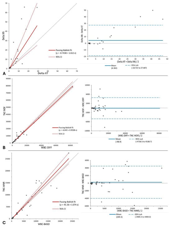 The ratio of the nucleated cell counts (ΔTNC) provided by the Sysmex XT-2000iV DIFF and BASO channels has been proven to be useful in differentiating effusions in cats; in particular, a ΔTNC > 2.5 was found to have high accuracy for effusive FIP. The objective of this study was to compare the ΔTNC obtained with the Sysmex XT-2000iV and Sysmex XN-1000V on different types of effusions. Fresh effusions from cats were evaluated with both analyzers. WBC-BASO, WBC-DIFF, and ΔTNC-XT from the Sysmex XT-2000iV and TNC-WNR, TNC-WDF, and ΔTNC-XN from the Sysmex XN-1000V were recorded and compared. Forty-five feline effusions were collected. The results were not significantly different for all parameters evaluated. The Passing and Bablok regression analysis for ΔTNC-XT and ΔTNC-XN revealed a slope of 1.612 (95% CI 1.030 to 2.316) and an intercept of −0.744 (95% CI −1.591 to −0.120); the Bland–Altman difference plot showed a positive bias of 4.382 (p = 0.02). Despite the finding of a positive proportional and constant bias between ΔTNC-XT and ΔTNC-XN, evident especially at high ΔTNC values, samples were classified accordingly between the two analyzers when ΔTNC-XT cut-offs were used, allowing the same accuracy for the identification of suspected and compatible FIP samples.