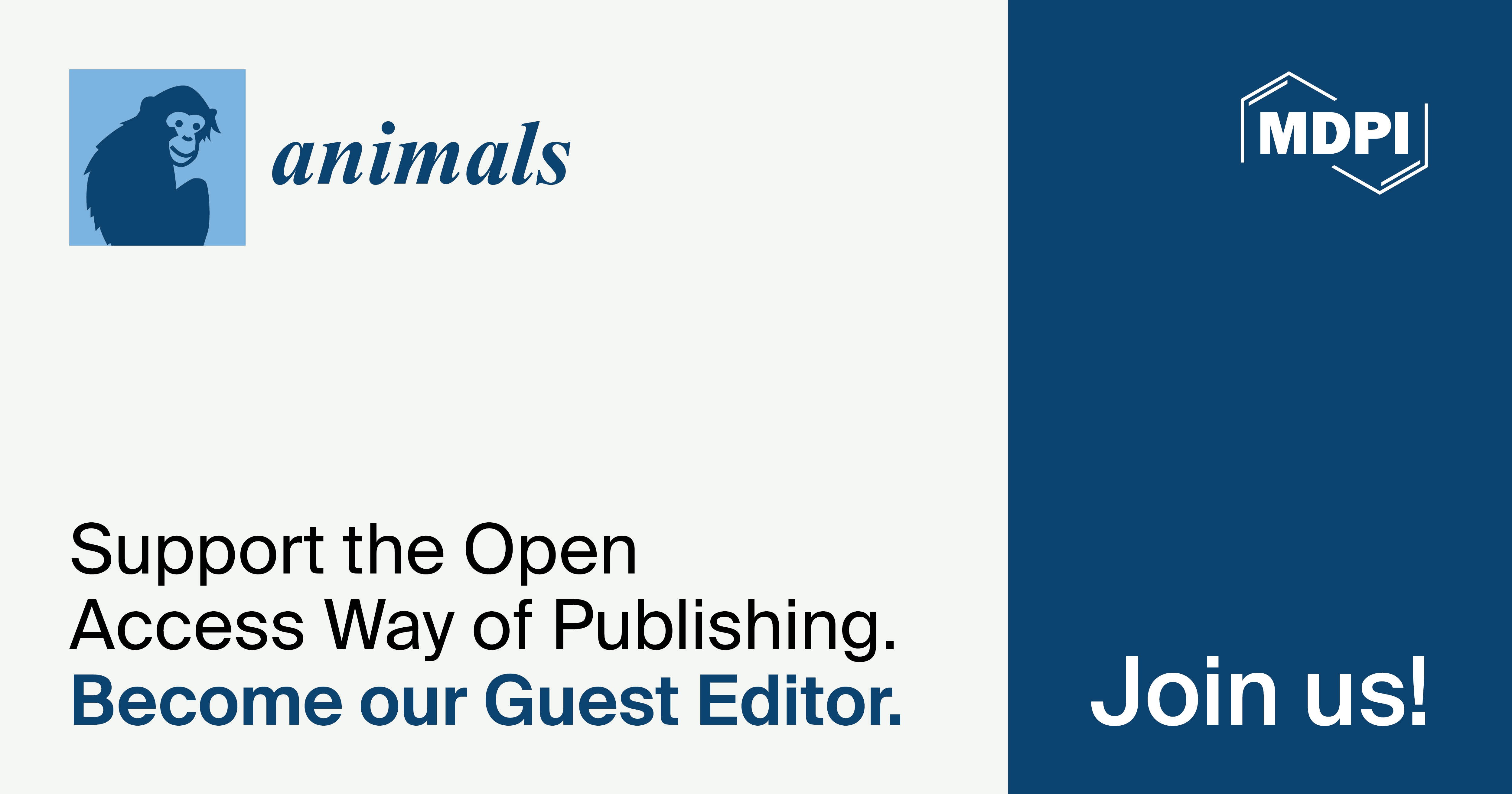 Animals (ISSN: 2076-2615) is an international, peer-reviewed, open access journal devoted entirely to animals, including zoology and veterinary sciences, published semimonthly online by MDPI. The journal focuses on any field of study that involves animals, including animal science, animal welfare, animal ethics, zoology, ethnozoology, and anthrozoology. More information about the journal is available at the following link: https://www.mdpi.com/journal/animals.