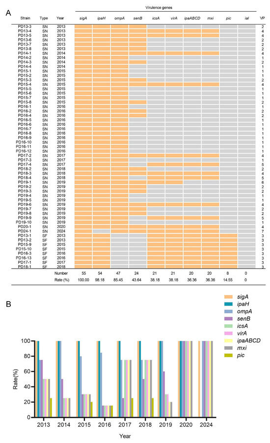 Background: Shigella spp. are critical pathogens causing diarrheal diseases. This study analyzed the epidemiological characteristics, antimicrobial resistance profiles, virulence factor profiles, and molecular patterns of Shigella isolates in Pudong New Area, Shanghai, from 2013 to 2024. Materials and Methods: Antimicrobial susceptibility of