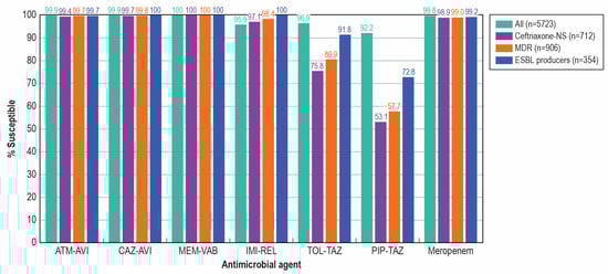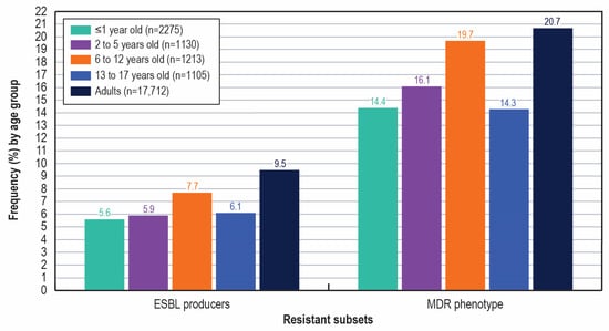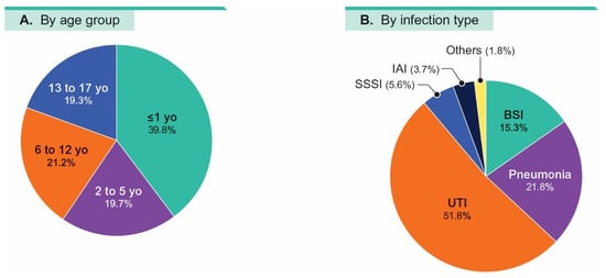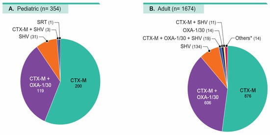 Objective: To evaluate the antimicrobial susceptibility of Enterobacterales isolated from pediatric patients. Methods: A total of 5723 isolates were consecutively collected (1/patient) from pediatric patients (<18 years old [yo]) from 82 United States medical centers in 2019–2023 and susceptibility-tested by broth microdilution method. Susceptibility was stratified by infection type and patient age: ≤1 yo (n = 2275), 2–5 yo (n = 1130), 6–12 yo (n = 1213), and 13–17 yo (n = 1105) and compared to adults (18–64 yo; n = 17,712). Results: Pediatric isolates were mainly from pneumonia (21.8%), bloodstream (BSI; 15.3%), and urinary tract infection (UTI; 51.8%). Aztreonam–avibactam, ceftazidime–avibactam, and meropenem–vaborbactam were active against ≥99.4% of ceftriaxone-nonsusceptible (99.4–100.0% susceptible), multidrug-resistant (MDR; 99.7–100.0% susceptible), and ESBL producer (99.7–100.0% susceptible) isolates from pediatric patients. Susceptibility to imipenem–relebactam varied from 97.1% (ceftriaxone-nonsusceptible) to 100.0% (ESBL producers). Ceftolozane–tazobactam showed good activity against ESBL producers (91.8% susceptible), but limited activity against ceftriaxone-nonsusceptible (75.8% susceptible) and MDR isolates (80.9% susceptible). The MDR phenotype varied from 14.3% (13–17 yo) to 19.7% (6–12 yo) among pediatric isolates (15.8% overall) and was 20.7% among adult Enterobacterales. Carbapenem resistance rates were markedly lower in pediatric (0.1%) isolates compared to adult isolates (1.3%). The ESBL profiles were similar among pediatric and adult isolates; 90.1% of ESBL producers from pediatric patients and 88.5% from adults carried a CTX-M +/− an OXA-1/30 gene. Conclusions: Antimicrobial resistance was generally lower among Enterobacterales from pediatric patients compared to adults. ESBL-producing Enterobacterales, mainly CTX-M, remain an important cause of infection in children. Aztreonam–avibactam, ceftazidime–avibactam, and meropenem–vaborbactam were highly active against isolates from both pediatric and adult population.