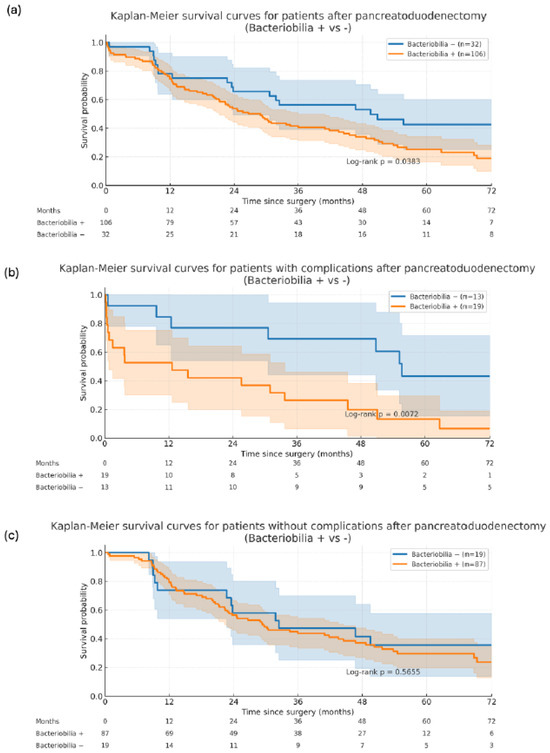 Background: Pancreatoduodenectomy (PD) remains the fundamental treatment for periampullary malignancies but is associated with considerable morbidity (20–50%) and mortality (2–7%). Bacteriobilia contributes to unfavourable postoperative outcomes. Current antibiotic prophylaxis recommendations endorse first-generation cephalosporins, which often fail to adequately target pathogens most frequently isolated from bile. To date, no specific guidelines for preoperative targeted antibiotic therapy have been established, although tailoring such strategies to the bile microbiome may improve surgical outcomes. This study aimed to characterize bile microbiology in patients undergoing PD for pancreatic ductal adenocarcinoma (PDAC), evaluating potential antibiotherapy regimens that provide effective coverage against the most frequently isolated pathogens. Methods: A retrospective cohort analysis of 725 patients surgically treated for pancreatic tumours at a high-volume pancreatic surgery center between 2017 and 2022 was performed. To minimize heterogeneity, study was restricted to 138 patients who underwent PD with histopathological confirmed PDAC. Intraoperative bile cultures were assessed. Results: Patients with bacteriobilia likewise experienced worse outcomes: higher 5-year mortality (OR 3.01, p = 0.007), greater overall postoperative pancreatic fistula (POPF) occurrence (OR 2.54, p = 0.044) and wound infections (OR 2.90, p = 0.038). Among bile microbiome the highest susceptibility rates were observed for combination of amoxicillin/clavulanic acid with gentamicin, while the lowest were noted for cephalosporin–metronidazole regimen (93.6% vs. 30.2%, respectively). Conclusions: Bacteriobilia contributes to postoperative complications and serves as a predictor of poorer survival after PD. Standard perioperative antibiotic prophylaxis in PD is insufficient. Based on our findings, perioperative antibiotic therapy with amoxicillin/clavulanic acid and gentamicin combination appears to provide superior coverage and may improve postoperative morbidity and overall survival following PD.