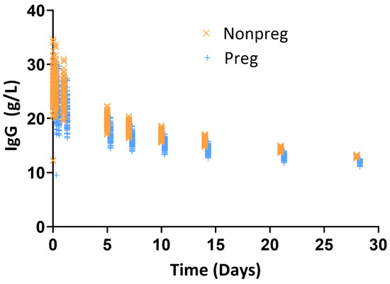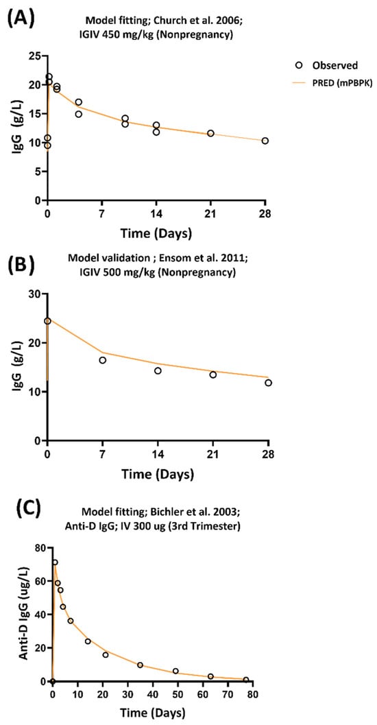 Background: Physiologically based pharmacokinetic (PBPK) modeling is applied to address clinical pharmacology issues including dose selection and exposure assessments for special populations (e.g., pediatrics, and renally or hepatically impaired patients). The objective of this study was to evaluate the predictive performance of a PBPK model for dosing assessment of intravenous immunoglobulin (IVIG) and anti-D immunoglobulin (anti-D Ig) products in pregnant women. Methods: A minimal PBPK (mPBPK) model that incorporates pregnancy-specific physiological parameters and allometric scaling approaches was developed and evaluated for predicting the exposure of IVIG and anti-D Ig in pregnant women. The concentration versus time data were obtained from the published literature. Results: The IVIG (n = 22) and anti-D Ig (n = 29) concentrations were predicted using the mPBPK model with an average fold error of 1.17 and 1.22, respectively. A total of 100% and 95% of IVIG concentrations were predicted within the 0.5–2-fold and 0.5–1.5-fold prediction error ranges, respectively. For anti-D Ig, predictions fell within the 0.5–2-fold and 0.5–1.5-fold ranges for 93% and 76% concentrations, respectively. A mPBPK model-based simulation following administration of 0.5 g/kg IVIG in 100 virtual nonpregnant and pregnant subjects revealed that the maximum plasma concentration (Cmax) was 15% lower and trough concentration (Ctrough) was 8% lower during the third trimester of pregnancy compared to nonpregnant subjects. In contrast, with flat dosing, Cmax and Ctrough were 32% and 26% lower in pregnant subjects, respectively. Overall, the model demonstrated reasonable predictive performance, and bodyweight-based dosing regimen is an acceptable approach that results in minimal change in exposure of IVIG in pregnant women.