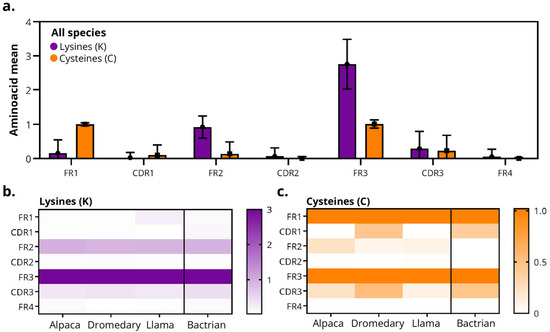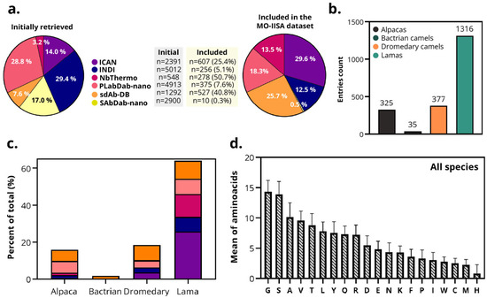 Background/Objectives: Single-domain antibodies (sdAbs) are derived from camelid heavy-chain antibodies (HCAb). Their small size, high stability, and ease of production, among other properties, makes them highly valuable in biomedical research and therapeutic development. Several sdAb-based molecules are currently progressing through clinical trials, highlighting their translational relevance. As sdAbs originate from HCAb of Camelidae family, they can originate from multiple species including Vicugna pacos, Lama glama, Camelus dromedarius and Camelus bactrianus. Although several reports and databases analyze the structure of sdAbs, comprehensive evaluations on species-dependent structural differences remain scarce. Methods: We assembled MO-IISA, an open-access curated database of sdAbs with known antigen targets by integrating six public resources (iCAN, INDI, SAbDab-nano, sdAb-DB, PLabDab-nano, NbThermo) under harmonized eligibility criteria. Results: The final dataset comprises 2053 sdAbs derived from llamas (Lama glama, n = 1316); alpacas (Vicugna pacos, n = 325), dromedary camels (Camelus dromedarius, n = 377) and Bactrian camels (Camelus bactrianus, n = 35). We quantified region lengths, amino acid frequency, and conservation/entropy across frameworks (FR1–FR4). The average length of all sdAbs was about 124 ± 8 amino acids, with minor interspecies differences. We observed a consistent enrichment of lysines in FR3 (and secondarily FR2) and cysteines primarily in FR1 and FR3, with non-canonical cysteines more frequent in Bactrian and dromedary sdAbs CDRs. CDR2 and, particularly CDR3, contributed most to inter- and intra-species variability, whereas FRs were highly conserved. Conclusions: Species-neutral framework constraints and species-tuned loop adaptations have practical implications for sdAb engineering, species selection, and conjugation strategies. These features are captured in MO-IISA, an open-access database of known-target sdAbs from different species.
