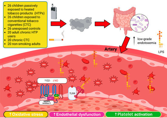 Background: Exposure to tobacco smoke, from conventional tobacco cigarettes (CTC) or heated tobacco products (HTPs), increases oxidative stress, causing endothelial dysfunction and higher cardiovascular risk. It is unclear whether smoke exposure also promotes low-grade endotoxemia, potentially activating NADPH oxidase and further impairing endothelial function. This study assessed serum lipopolysaccharide (LPS) levels in children and adults actively or passively exposed to conventional cigarette smoke or HTPs, compared with non-exposed controls. Methods: We conducted a cross-sectional study comprising 26 children passively exposed to HTPs, 26 children exposed to CTC, and 26 unexposed controls, as well as 20 adult chronic HTP users, 20 chronic CTC, and 20 non-smoking adults. Circulating LPS was measured alongside oxidative stress markers (NOX2, H2O2), endothelial function, intestinal permeability (zonulin), and nicotine exposure (serum cotinine). Results: Exposed children had higher cotinine, LPS, and zonulin than controls, with no differences between HTP and CTC groups. Multiple linear regression analysis identified cotinine (β = 0.343; p = 0.005) and zonulin (β = 0.441; p < 0.001) as independent LPS predictors. In adults, LPS and zonulin were higher in both smoker groups versus controls; zonulin (β = 0.477; p < 0.001) and nitric oxide bioavailability (β = −0.307; p = 0.007) independently predicted LPS. Conclusions: Passive and active exposure to CTC or HTPs increases low-grade endotoxemia and zonulin, potentially driving NOX2-mediated oxidative stress.