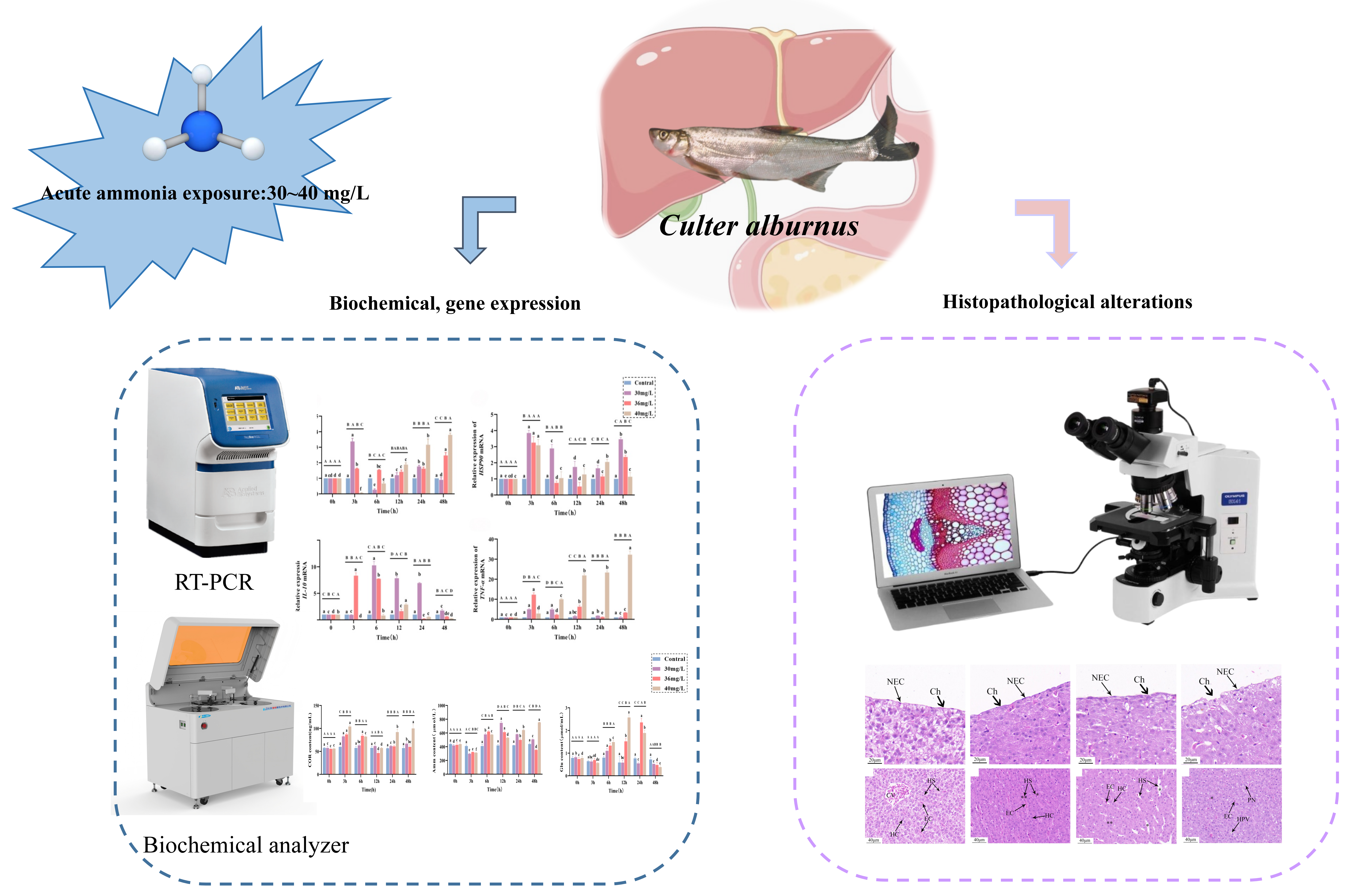 The Xingkai Lake topmouth culter (Culter alburnus) is an endemic, economically valuable fish in Heilongjiang that is highly sensitive to ammonia. However, the systemic effects of acute ammonia stress on its liver have not been determined. The objective of this study