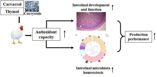 Dietary Thymol–Carvacrol Cocrystal Supplementation Improves Growth Performance, Antioxidant Status, and Intestinal Health in Broiler Chickens