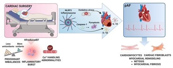 Cardiopulmonary bypass (CPB) can lead to cardiac damage due to oxidative stress (OS) and inflammation in heart failure (HF). We tested the hypothesis that preoperative HF patients with reduced ejection fraction (HFrEF) subjected to CBP have higher levels of OS and NLRP3 (NOD-, LRR- and pyrin domain-containing protein 3) in heart and plasma and in those that develop postoperative AF (pAF) as a clinical outcome. HF was categorized for preoperative left ventricular EF: preserved (HFpEF > 50%, n = 27) and reduced EF (HFrEF ≤ 40%, n = 25). Samples of atrial tissue, pericardial fluid, and plasma were collected at surgery to assess NLRP3 expression; 3-nitrotyrosine (3-NT), thiobarbituric acid reaction (TBARS), and nuclear factor erythroid 2-related factor 2 (Nrf2) in atrial tissue; NLRP3, IL-1β, and IL-18 expression in pericardial fluid; and antioxidant capacity, 8-isoprostanes, and malondialdehyde (MDA) in plasma. Reactive oxygen species, 3-NT, and NLRP3 in atrial tissue were determined by immunohistochemistry in a subset of pAF patients. Plasma and atrial tissue 3-NT and MDA were higher in HFrEF compared with HFpEF. Lipid peroxidation products were higher in both plasma and atrial tissue in pAF (n = 29), compared to sinus rhythm (SR) (n = 23). In HFrEF patients, the values of tissue ROS, 3-NT, and NLRP3 were higher than in HFpEF patients. In addition, the expression levels of NLRP3, IL-1β, and IL-18 were higher in atrial tissue and pericardial fluid in HFrEF. Patients with preoperative HFrEF showed higher OS in plasma and the expression of NLRP3, ROS, and 3-NT in atrial tissue biopsies and pericardial fluid. This finding suggests a potential pharmacologic therapy for pAF and clinical complications due to CPB.