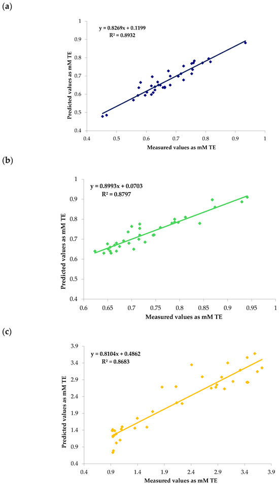 The olive tree has exceptional agricultural and economic importance in Mediterranean regions due to its fruit, which is used to produce olive oil. However, the olive oil industry generates a significant amount of waste, including leaves from Olea europaea L. These leaves contain a high concentration of bioactive compounds, predominantly phenolic ones, which are well known for their antioxidant properties and health benefits. Determining antioxidant capacity involves the use of different assays based on absorbance (DPPH, 2,2-diphenyl-1-picrylhydrazyl; and ABTS, 2,2′-azino-bis(3-ethylbenzothiazoline-6-sulfonic acid)) and fluorescence (ORAC, Oxygen Radical Absorbance Capacity), which require reagents and long waiting times. Therefore, having a non-destructive technique capable of providing this information would be useful. To explore this, 120 olive leaf samples were analyzed using the three antioxidant assays to quantify their total antioxidant capacity. Predictive models were successfully developed for each of the three methods, achieving coefficients of determination (R2) between 0.9 and 1 across calibration, validation, and prediction. Additionally, high residual predictive deviation (RPD) values were obtained, indicating that the models exhibit strong reliability and predictive performance.