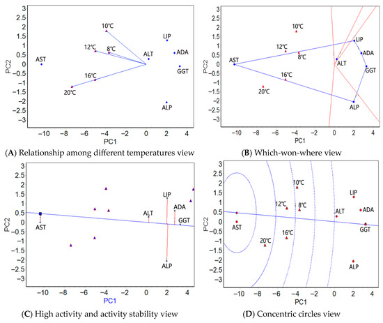 Antioxidant and serum enzyme activities of the large yellow croaker (Larimichthys crocea) were analyzed to investigate the influences of genotype and water temperature. The activities of four antioxidant factors (peroxidase, catalase, total antioxidant capacity, and superoxide dismutase [SOD]) in the muscle and liver, as well as six serum enzymes (alkaline phosphatase, lipase, aspartate aminotransferase [AST], adenosine deaminase, γ-glutamyl transpeptidase (GGT), and alanine aminotransferase), were measured at natural water temperatures (20, 16, 12, 10, and 8 °C). Analysis of the antioxidant enzyme activities showed that genotype, temperature, and genotype × temperature interactions had different influences on the two tissues. In muscles, the impacts of these three effects on antioxidant enzyme activity were extremely significant, while in the liver, only the genetic effects were extremely significant and the temperature effect was insignificant. SOD exhibited the highest and the most stable activity and the best performance in terms of both activity and stability in both tissue types. Temperature, genotype, and genotype × temperature interactions all had a prominent impact on serum enzyme activity. The indicators that were the top performers in terms of activity, stability, and the optimal balance of both were AST, GGT, and AST, respectively. Our findings provide a theoretical basis for breeding with low-temperature tolerance based on antioxidant factors, reliable tolerance indicators, and the evaluation and early detection of low-temperature stress using serum-based enzyme biomarkers.
