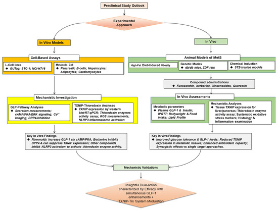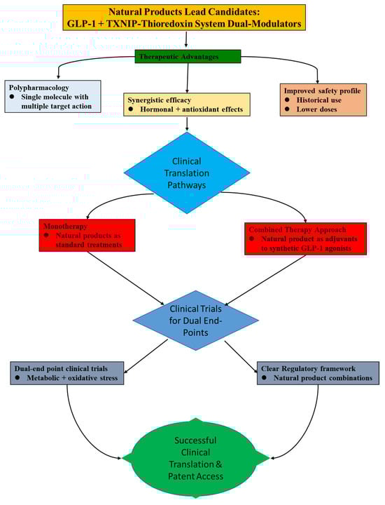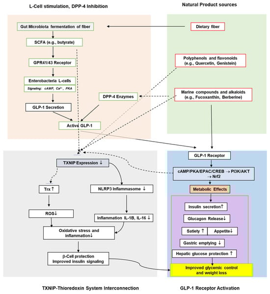 Metabolic Syndrome (MetS), a cluster of interconnected metabolic abnormalities, poses a growing global health burden. A well-established therapeutic target for the diseases is the incretin hormone glucagon-like peptide-1 (GLP-1); however, synthetic agonists have drawbacks such as expense, injectable administration, and side effects. Concurrently, one of the main pathogenic characteristics of MetS is oxidative stress, in which the Thioredoxin-Interacting Protein (TXNIP)/thioredoxin system is a critical player. The strong evidence that natural compounds derived from plant, marine, and microbiological sources can simultaneously target the TXNIP–thioredoxin antioxidant axis and GLP-1 signaling is examined in this study. These substances can limit TXNIP expression and increase thioredoxin activity while also stimulating GLP-1 secretion, inhibiting dipeptidyl peptidase-4 (DPP-4), or acting as GLP-1 receptor agonists. A cycle of reinforcement is created by these two actions: Pancreatic β-cell activity and incretin responsiveness are improved by GLP-1-mediated TXNIP downregulation, which also strengthens antioxidant defense. However, translational development must overcome major pharmacological obstacles, especially those related to bioavailability, metabolic stability, and standardization, despite encouraging preclinical effectiveness. To speed up this translational process, integrative computational techniques (such as molecular docking, network pharmacology, and artificial intelligence) are strong tools for lead optimization and creation of hypothesis. Thus, natural products can provide a special chance to discover multi-target treatments that comprehensively address the oxidative and hormonal causes of MetS.