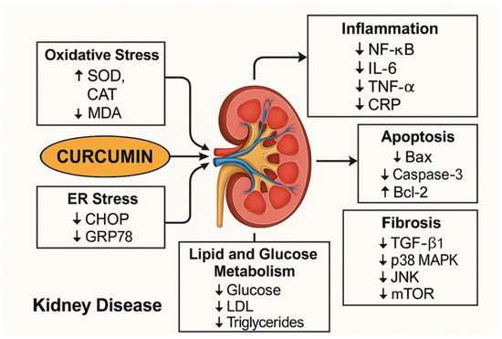 Kidney disease (KD) is a major health challenge, affecting millions of people worldwide, highlighting the need for improved prevention and management strategies. The pathophysiological mechanisms converged on a common pathway characterized by inflammation, oxidative stress, fibrosis, nephron loss and failure. Curcumin, the active
