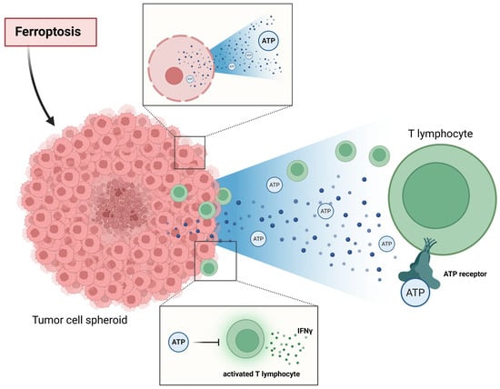 Glioblastoma is one of the most aggressive and therapeutically challenging brain tumors. It is characterized by a highly immunosuppressive tumor microenvironment and poor prognosis, requiring novel treatment strategies. Along this line, ferroptosis has been proposed. To study the impact of ferroptosis on glioblastoma cells and immune cell infiltration, we established a spheroid model using LN229 glioblastoma cells and verified ferroptosis by measuring lipid peroxidation and RNA expression of ferroptosis-related genes. We then co-cultured spheroids with human peripheral blood mononuclear cells to follow the infiltration of distinct immune cell subsets by flow cytometry and immunohistochemistry. T lymphocyte infiltration into ferroptotic spheroids compared to control spheroids became apparent with the notion that ferroptotic cells attracted T cells more efficiently compared to apoptotic or necrotic cells. Mechanistically, ferroptotic glioblastoma spheroids released high amounts of ATP, which caused T cell attraction, while ATP deprivation reduced this effect. Ferroptosis appears to be an interesting therapy approach but might need co-treatments to ensure proper T cell activation.