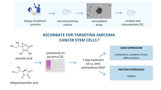 The resilience of sarcomas, tumors characterized by resistance to therapy and high metastatic potential, is largely driven by the unique characteristics of a small population known as cancer stem cells (CSC). Although ascorbic acid (AA) and its oxidized form, dehydroascorbic acid (DHA), have shown potential for selectively targeting cancer cells, their effects on sarcoma CSCs remain insufficiently explored. Still, recent research indicates that AA can affect the specific characteristics of CSC and lead to their cytotoxicity. To investigate the sensitivity of sarcoma CSCs to ascorbate, CSCs were isolated from six sarcoma patient-derived samples using a sphere assay, and their stem identity was evaluated through gene expression profiling and dye-efflux assays. Cytotoxicity testing of AA and DHA showed that DHA has a selective cytotoxic effect on cancer stem cells. The presence of basic fibroblast growth factor (bFGF), which is commonly used to support the self-renewal of CSCs, had an influence on the cytotoxic effect of DHA. To evaluate the difference in the effect of AA and DHA, a seven-day treatment of CSCs with these forms of ascorbate was performed. The gene expression analysis revealed that DHA in the presence of bFGF had a stronger impact on response to oxidative stress and cellular metabolism. Also, investigation of somatic mutations of oncogenes and tumor suppressors revealed that in liposarcoma and rhabdomyosarcoma, there are mutations that induce proliferative signals. These proliferative signals, joined with bFGF in the presence of DHA, do not lead to proliferation but instead cause cell death.